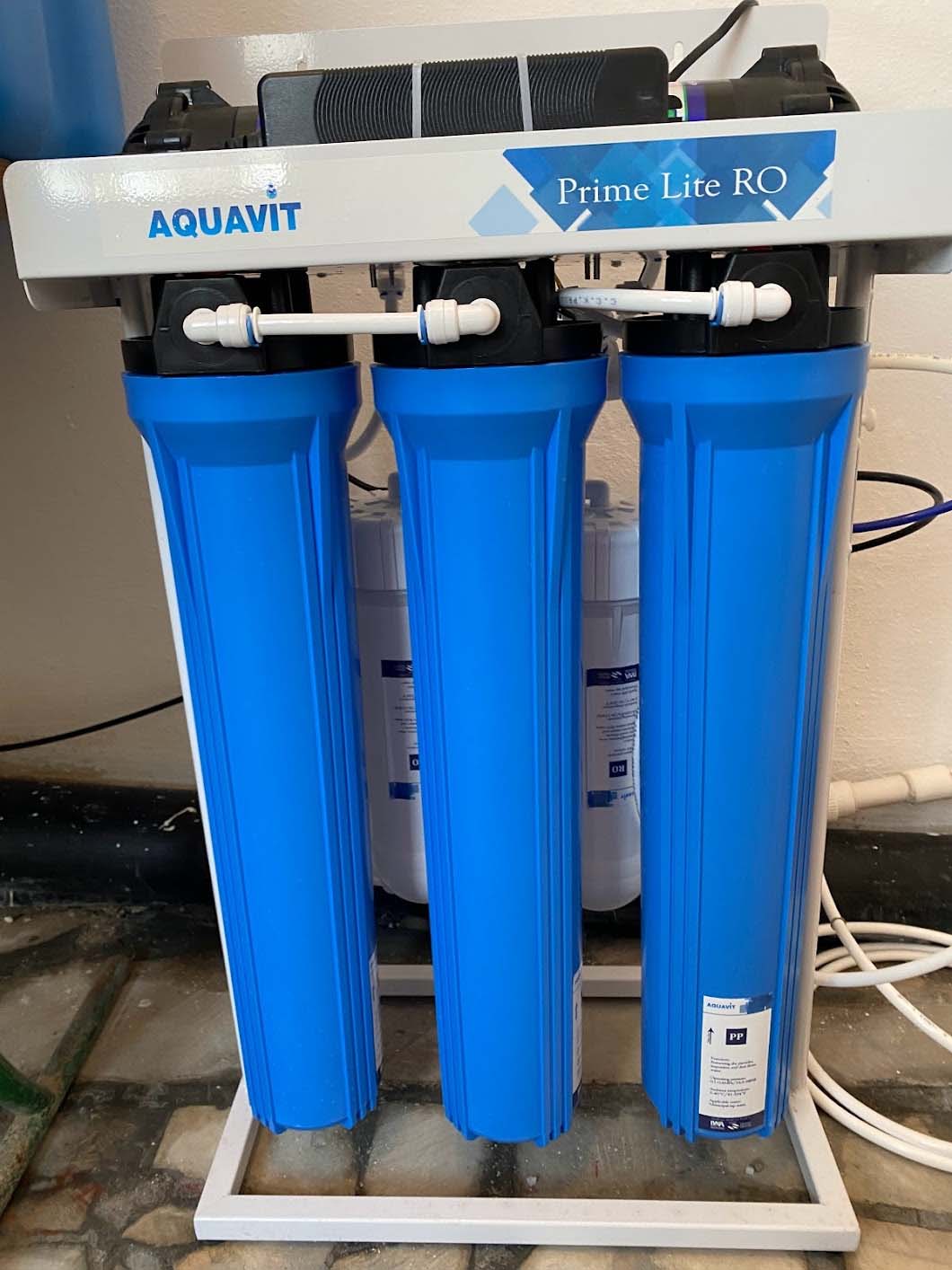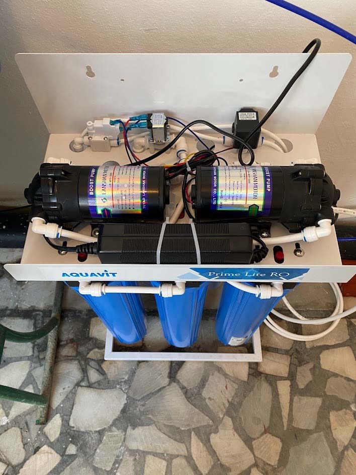 Two filters were procured for installation. The first, larger one was a Volardda HLD RO-0.5T/H. The 3-tank reverse osmosis system has a capacity of filtering 500 liters per hour with a desalination rate of 95%. After installation, we recorded .05 mg/liter of salt in the purified water, a 96% reduction.