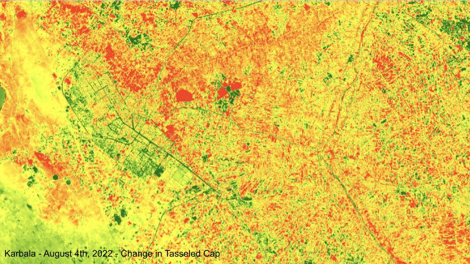 Overall, over half of all area in Karbala region expressed a decline in the Tasseled Cap component value correlated with palm tree forests between 2013 and 2020. That equates to nearly 2,000 square kilometers experiencing deforestation in Karbala alone. The results of this project were shared with UN WASH to help them understand the extent of deforestation in Iraq and to inform their work on the ground.