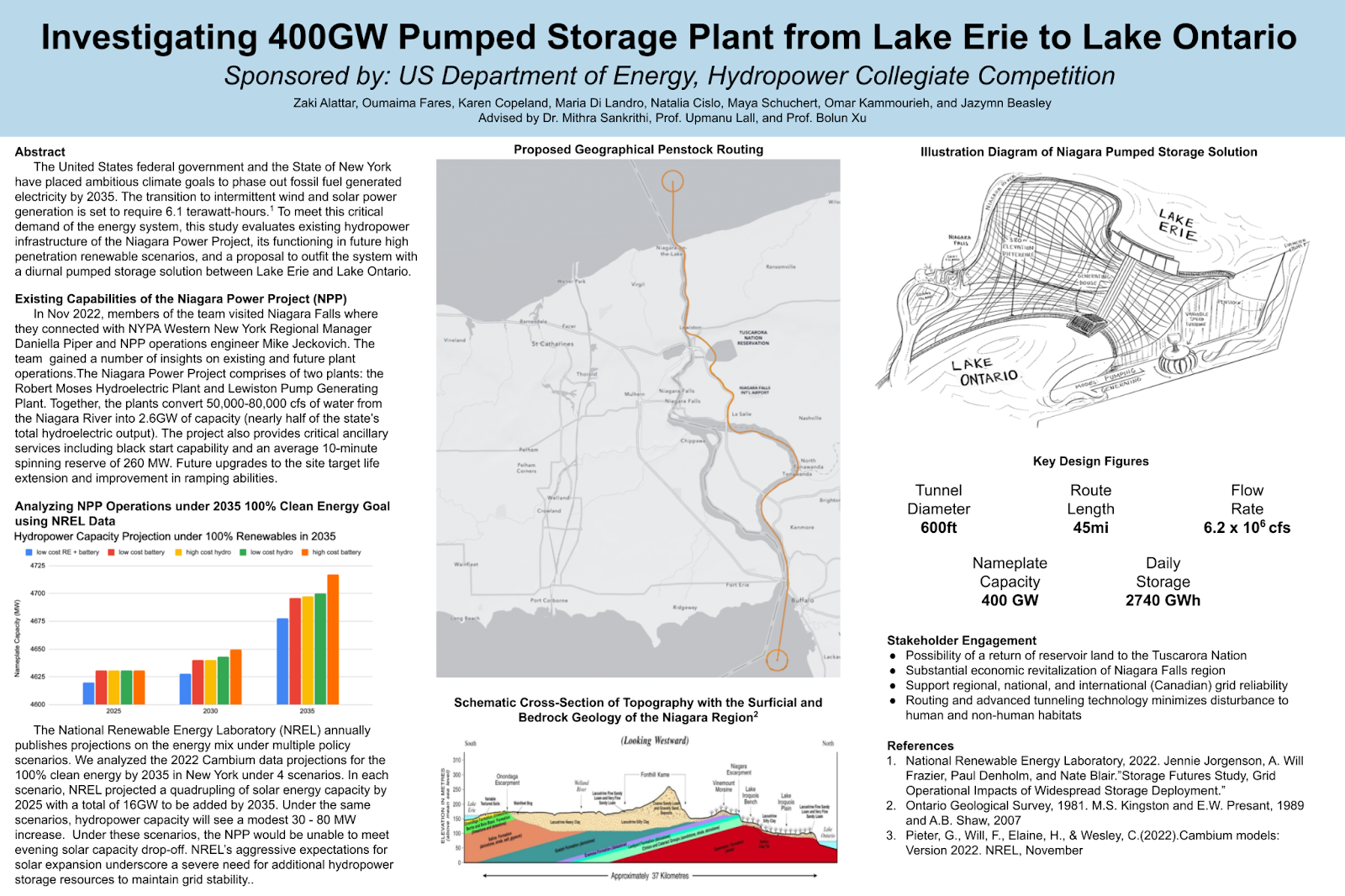 During the 2022-2023 academic year, we competed alongside 12 other universities in the Department of Energy's Hydropower Collegiate Competition. Our case study investigated a possible pumped storage hydropower plant between Lake Erie and Lake Ontario. We presented our solution at the 2023 Water Power Week in Washington, DC.